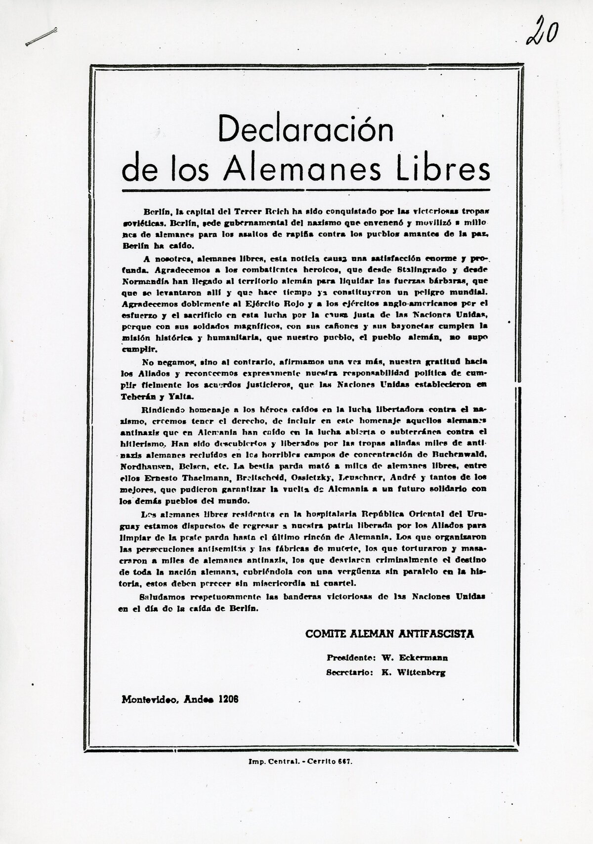 „Die freien Deutschen, die in der gastlichen Republik Uruguay leben, sind bereit in unsere von den Alliierten befreite Heimat zurückzukehren, um den letzten Winkel Deutschlands von der braunen Pest zu befreien.“ (Erklärung der Freien Deutschen, Montevideo, 3. Mai 1945).