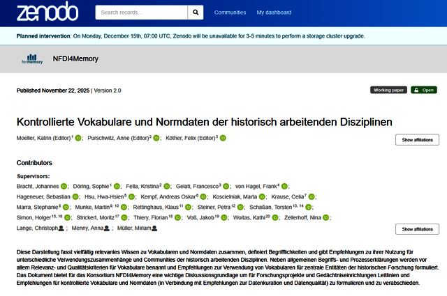 Nachdem im Juni 2025 in Halle unter dem Dach von NFDI4Memory ein Workshop zu Herausforderungen und Potenzialen von Thesauri für das Fach jüdische Geschichte gemeinsam mit dem Moses Mendelsohn Zentrum in Potsdam veranstaltet werden konnte, waren Dr. Anna Menny und ihre Kollegin Nina Zellerhoff M.A. (MMZ) nun auch an der Kommentierung des von Dr. Katrin Moeller, Felix Köther M.A. und Dr. Anne Purschwitz verfassten Whitepaper “Kontrollierte Vokabulare und Normdaten der historisch arbeitenden Disziplinen (Version 2.0)”, Historisches Datenzentrum Sachsen-Anhalt, Halle 2025, beteiligt. Dabei haben sie den Blick auf Besonderheiten im Feld der jüdischen Geschichte und Studien gerichtet. Das Paper, das auf Zenodo publiziert wurde, versteht sich als eine Handreichung sowie Orientierungshilfe für das geschichtswissenschaftliche Arbeiten. Es bietet einen Überblick über Vokabulare und Normdaten in den historische arbeitenden Disziplinen, neben Begriffsdefinitionen sind auch Empfehlungen und Musterbeispiele enthalten.