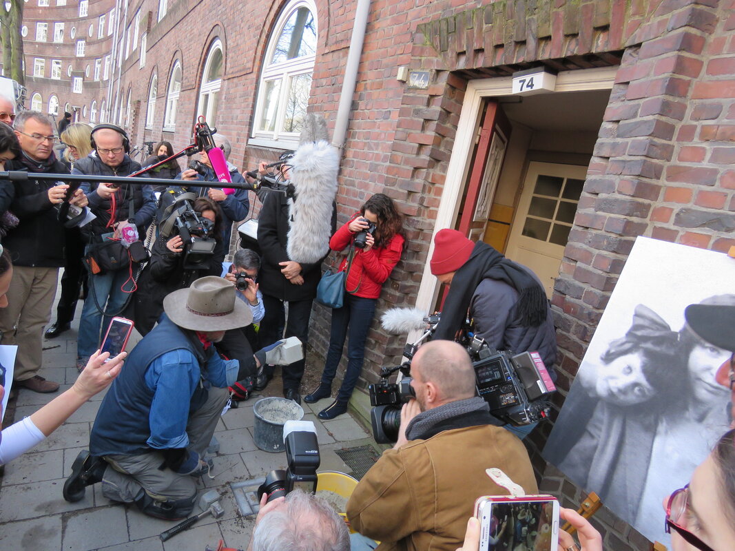 Die Projektbeteiligten präsentieren zudem die Biografien in Hamburg auf Veranstaltungen, sie bieten anreisenden Angehörigen Begleitung bei der familiären Spurensuche oder interessierten Hamburgerinnen und Hamburgern Rundgänge zu den Stolpersteinen an.
